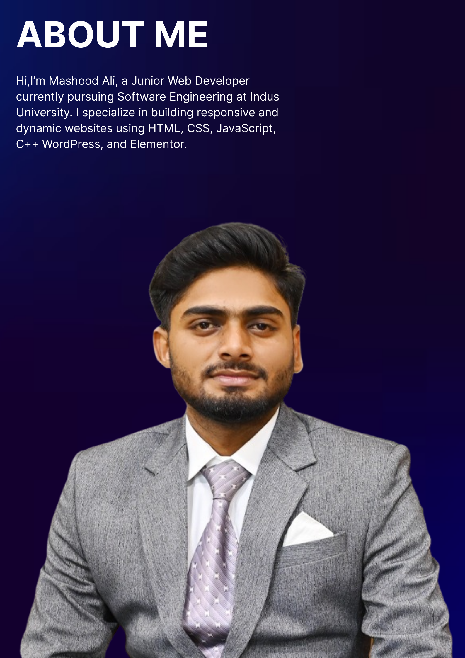 Hi, I’m Mashood Ali, a Junior Web Developer currently pursuing Software Engineering at Indus University. I specialize in building responsive and dynamic websites using HTML, CSS, JavaScript, C++ WordPress, and Elementor.